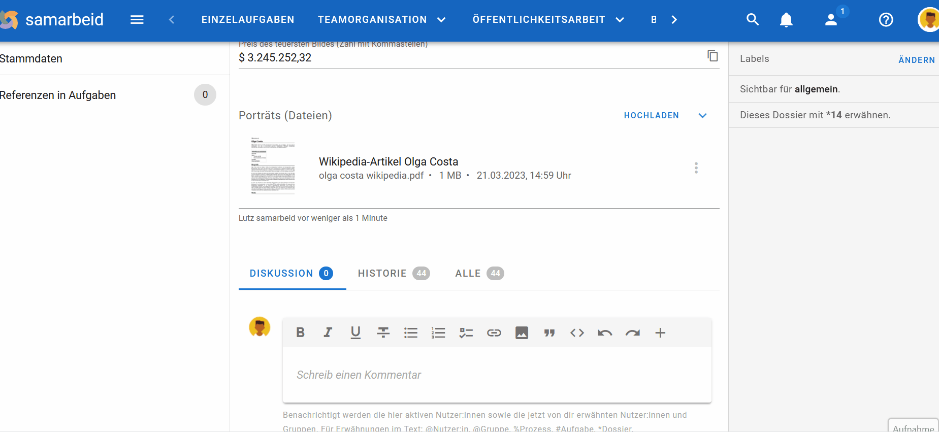 Das ist jetzt alles viel komfortabler. In allen Datei-Datenfeldern gibt es jetzt eine kleine Vorschau für jede Datei. Mit einem Klick auf das Vorschaubild öffnet sich das Viewer-Overlay und ihr könnt euch die ganze Datei anschauen. So könnt ihr dank des eingebauten PDF-Viewers eure PDFs direkt in samarbeid lesen und müsst sie nicht mehr herunterladen.
